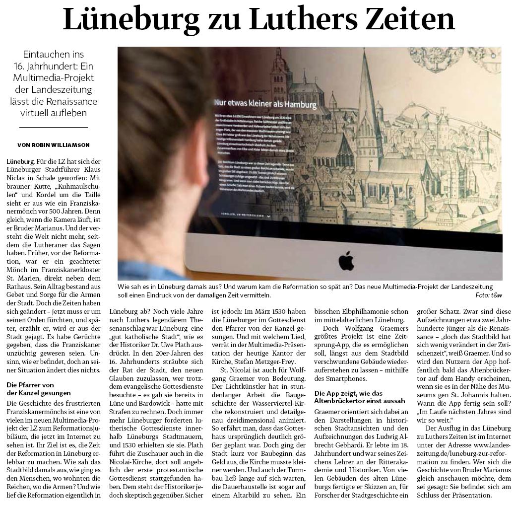 Graemer geht einen Schritt weiter. Natürlich kann mit der digitalen Grundlage auch eine spätere Zeit dokumentiert werden, etwa die Industrialisierung Lüneburgs im 19. Jahrhundert, als die Stadt wuchs und sie weite Teile ihrer Mauern schleifte. Auch die Jahre des Nationalsozialismus und der Aufbruch nach dem Zweiten Weltkrieg wären Themen. Er glaubt, weitere Partner für sein Projekt zu finden. So plant er für Oktober eine Informationsveranstaltung. Er ist optimistisch: „Im Laufe nächsten Jahres sind wir so weit.“